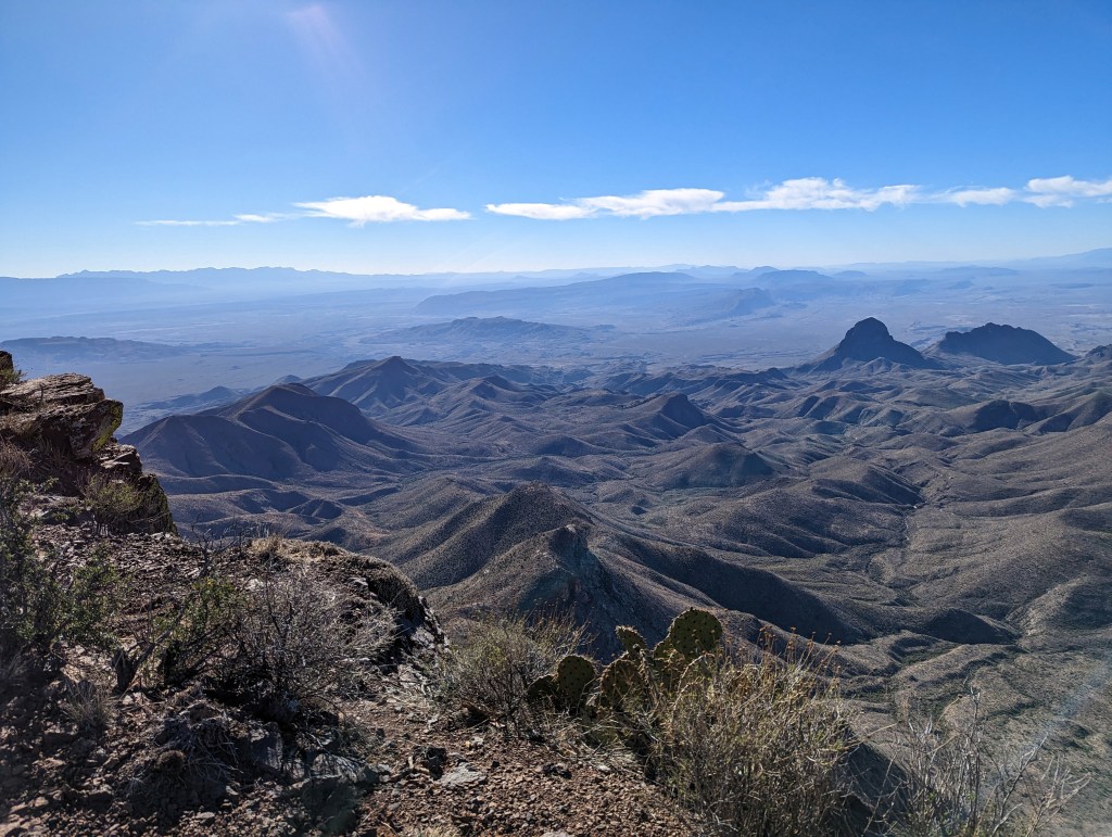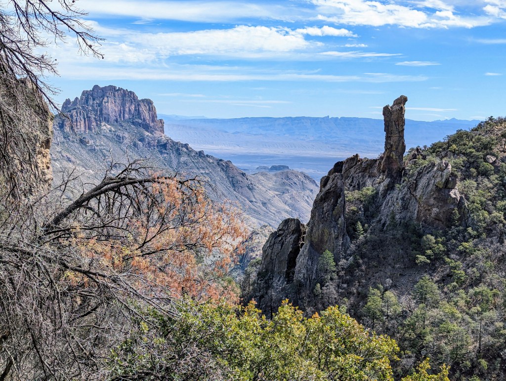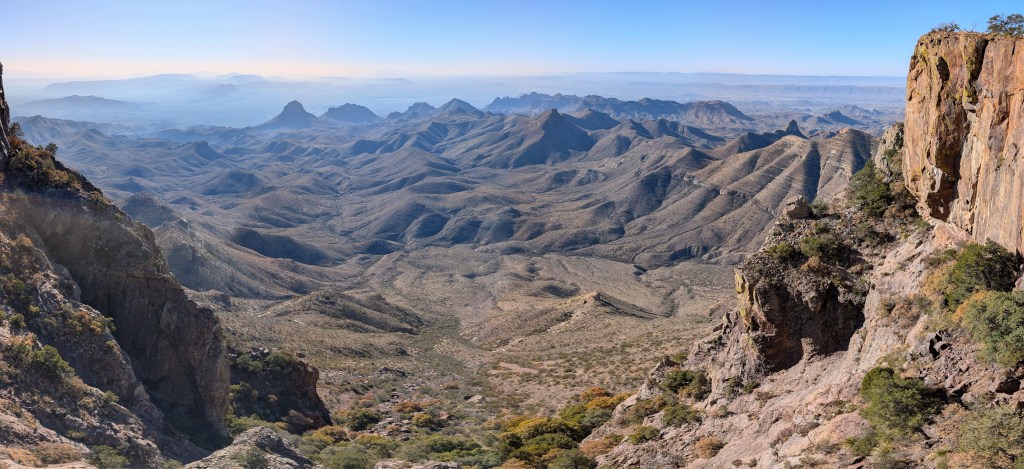 The climb to the ridge went quickly despite his languid gait. After the Pinnacles he passed over the mostly dry creek in Boot Canyon. Upon crossing a grassy field he was suddenly on the South Rim. Here he seemed to be standing on a wall, gazing into a sunken landscape which stretched for miles. Smoke from far-away wildfires had drifted across the arid terrain, dulling some of the sharpness but not the grandeur. In the distance past Mule Ears, he could see Mexico – with Santa Elena canyon carved into the escarpment. Below it a green streak snaked across the valley showing the course of the Rio Grande.
