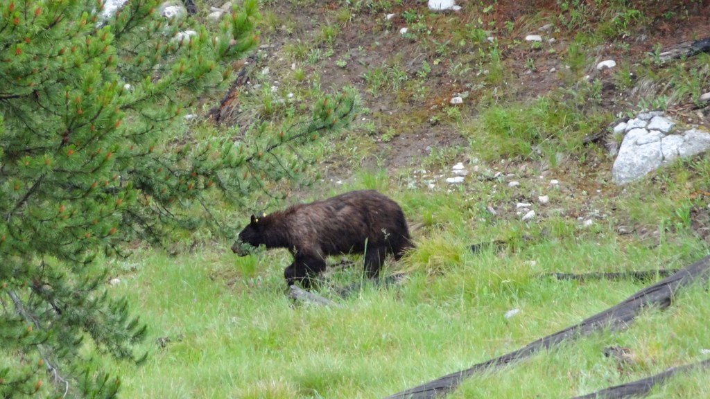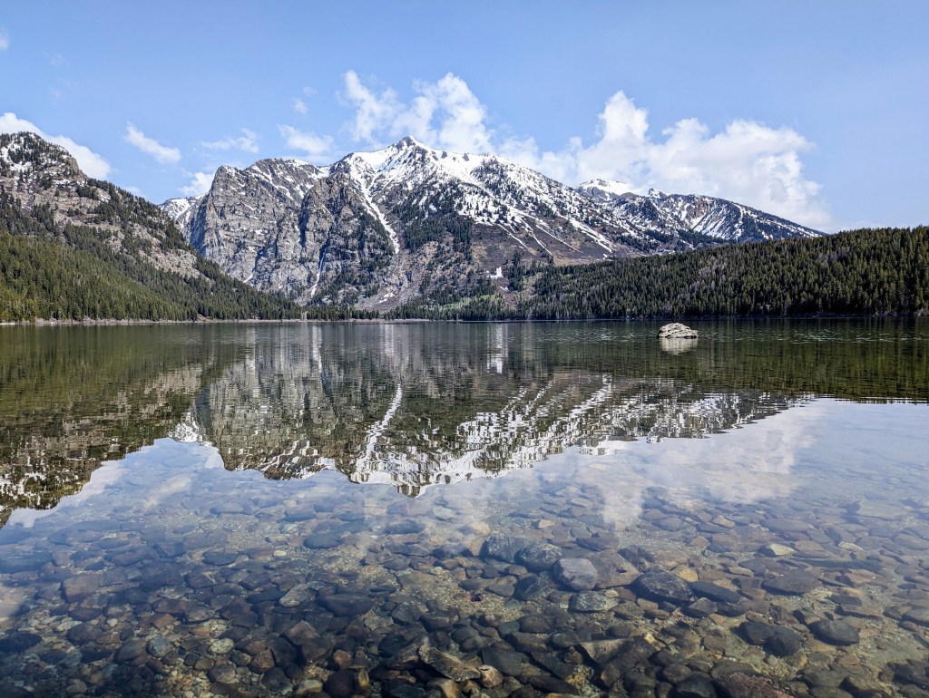 Megan started back down the trail, returning via the other side of the lake. The large “jumping rock” passed by – a popular summer swimming destination of the locals. A solitary hiker strode up from the other direction – the fifth and last person she would see in the valley today. With three elk, two moose, and three marmots, there were more animals than humans for company.