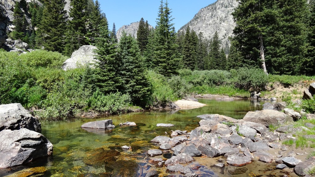 At a fork she turned to follow a narrow path toward Death Canyon. After a while, a large rock esplanade appeared just off the trail. Megan turned down the spur and was soon sitting on the stone’s expansive surface, peering alternatively into the stream below and to the mountain above as she drank from a water bottle.